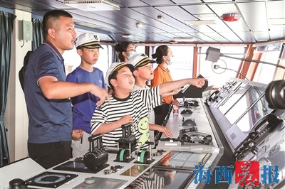 启动仪式结束后,“嘉庚号”船体内部探访之旅开启。孩子们依次参观了甲板、实验舱、资料室以及驾驶室等,聆听工作人员介绍海洋知识。