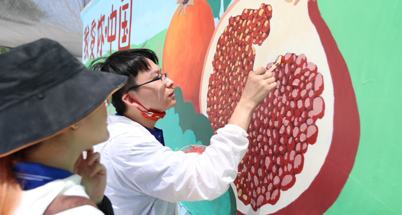 此外,实践队还在墙绘中融入石榴籽元素,表现中华56个民族像石榴籽一样紧紧地抱在一起。队员们邀请当地回族村民和小朋友共同完成墙绘,大大小小的56个七彩手印不仅寓意着闽宁携手的山海情缘和民族团结之情薪火相传,更是对伟大祖国的深情告白。