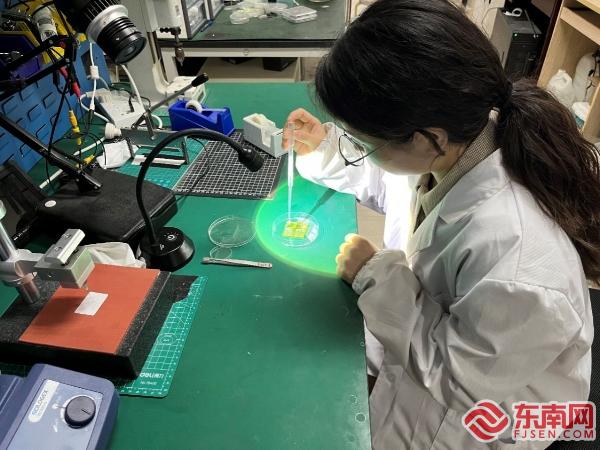 张金惠进行刚柔并济柔性触觉传感器制备实验(厦大供图)