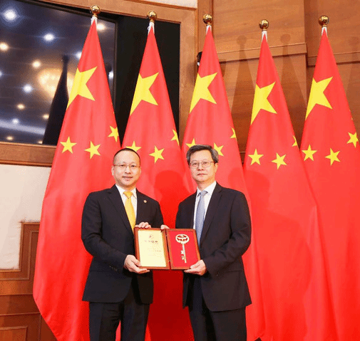厦门市市长庄稼汉给曾志龙(左)颁发厦门荣誉市民证书