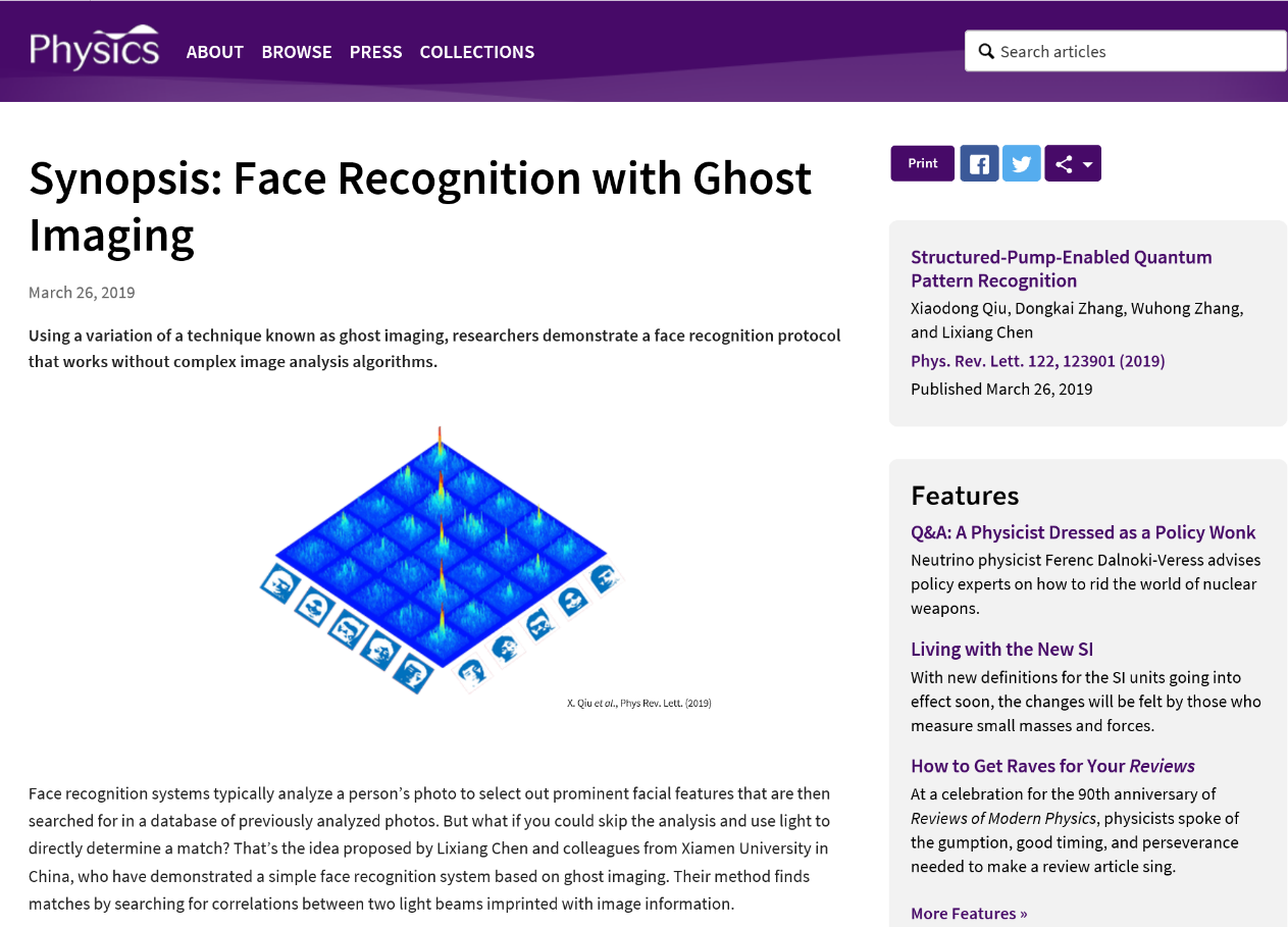 最近,物理科学与技术学院陈理想教授团队在光场调控及量子模式识别技术上取得重要进展,相关研究成果 “Structured-pump-enabled quantum pattern recognition”发表在国际物理学顶级期刊《物理评论快报》 (Physical Review Letters, DOI: 10.1103/PhysRevLett.122.123901),并被编辑遴选为Editors’ Suggestion在Physical Review Letters主页推荐介绍,同时美国物理学会(APS)网站Physics也以“Face Recognition with Ghost Imaging”(基于鬼像的人脸识别)为题撰写Synopsis对该工作进行了全文亮点报道。