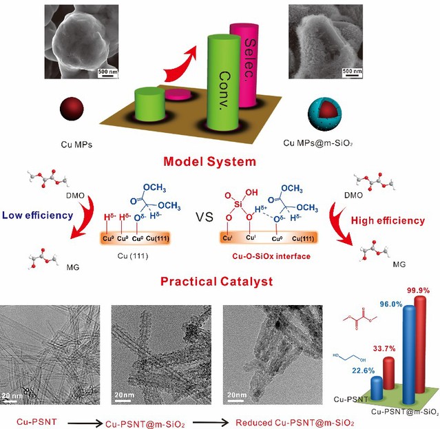 与厦门大学傅钢、袁友珠教授以及中国科学院物理研究所谷林研究员密切合作,历时五年,在多相催化的金属-载体界面效应研究方面取得重要进展。SiO2被广泛用作工业负载型金属催化剂的载体,多被视为惰性载体,在催化过程中仅起到分散金属的作用。郑南峰教授领衔的合作研究打破这个催化领域的“定式”。他们发现了“惰性”载体SiO2与Cu之间存在可以数量级提升酯基加氢催化性能的活性界面,揭示了相关界面效应的分子作用机制,并应用于指导实用铜催化剂的制备。相关成果 “Interfacing with silica boosts the catalysis of copper”发表于《自然 通讯》(Nature Communications, 2018, 9, 3367)。