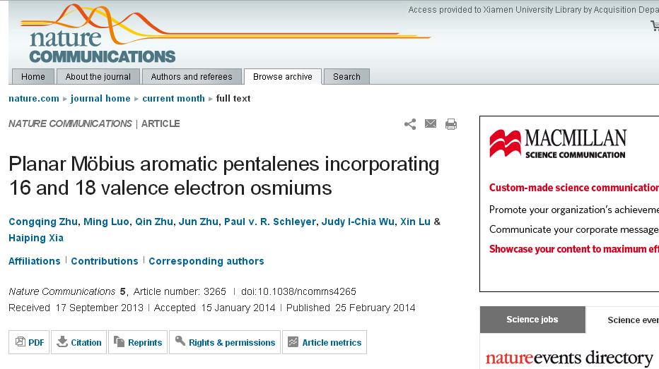 我校化学化工学院夏海平教授、朱军副教授等在金属杂戊搭炔化学上再次取得重要进展,于2014年2月25日在《自然-通讯》上(Nat.Commun.,2014,5,3265doi:10.1038/ncomms4265)发表了题为“Planar Möbius Aromatic Pentalenes Incorporating 16 and 18 Valence Electron Osmiums”的研究成果。