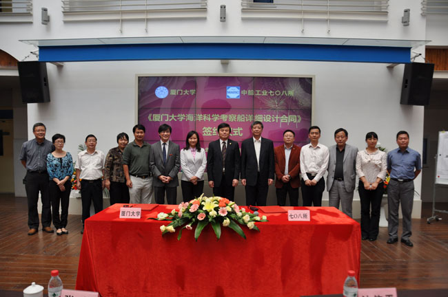 厦门大学重点建设的3000吨级海洋科学考察船详细设计招标工作已圆满结束。11月2日下午,我校张颖副校长代表校方与中国船舶工业集团公司第七○八研究所沈伟平副所长在曾呈奎楼正式签订科学考察船详细设计技术合同,教育部科技司基础处邹晖副处长与学校相关部门、海洋与地球学院及环境与生态学院师生代表见证此次签约。厦门大学海洋科学考察船项目详细设计技术合同的签署,是继今年5月份与美国Glosten公司签订初步设计技术合同之后又一具里程碑式意义的事件,标志着我校海洋科学考察船距船厂招标建造只有一步之遥。