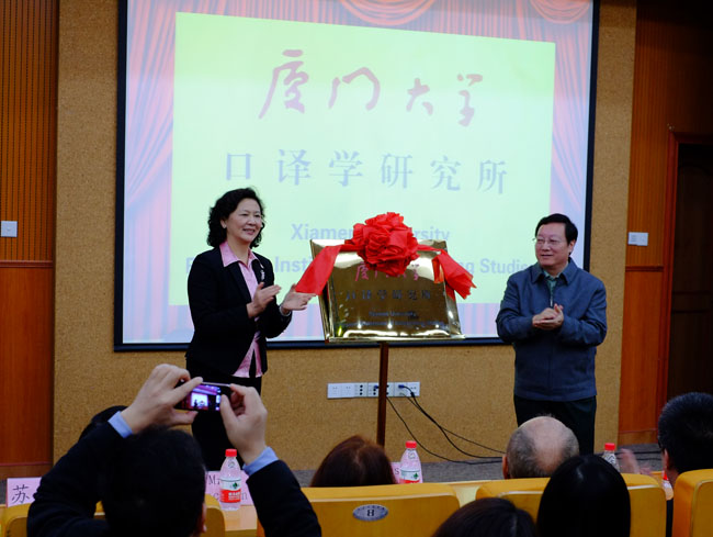 厦门大学口译学研究所成立揭牌暨厦门大学口笔译资格证书考试中心十周年庆典活动于2012年12月8日上午九点整在厦门大学化学报告厅举行。出席此次庆典活动的有:厦门市委副书记钟兴国,厦门大学副校长詹心丽,厦门市外事办副主任黄峰,国际语言测试学会前主席,世界知名语言测试专家LyleBachman、商务部欧盟处处长余元堂、厦大口译考试全国各考点负责人、厦门大学国际处、教务处、社科处、研究生院、海外教育学院等单位的领导、厦大口译学科创始人林郁如、厦大外文学院苏子惺书记和外院师生,以及来自厦门和周边高校的口译学子等。庆典由厦大口译教研团队的杨柳燕老师主持。