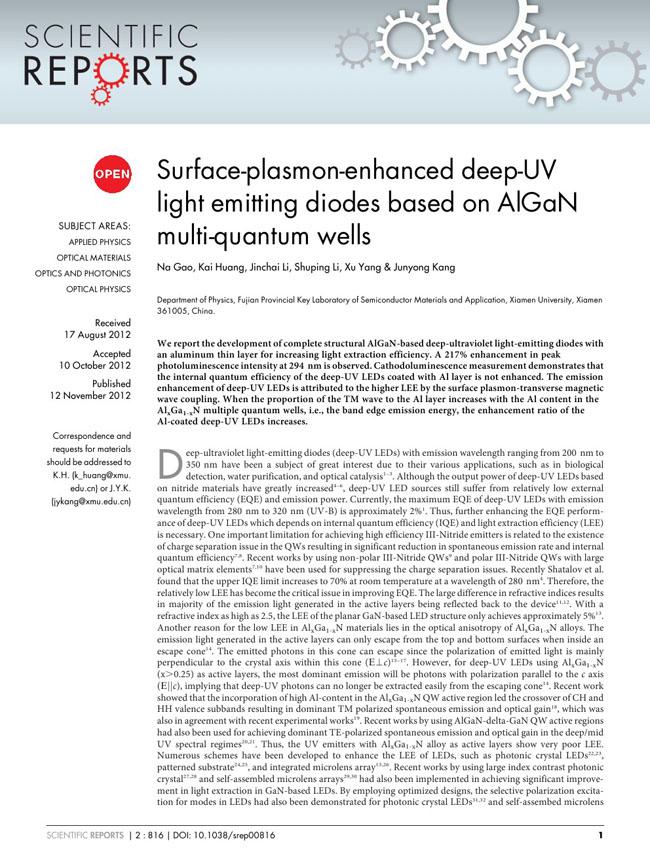 我校物理与机电工程学院一个研究小组通过在高铝组分氮化物深紫外线发光二极管(LED)表面覆盖一层超薄铝膜,从而破解制约这一发光器件得以更广泛应用的“光抽取效率”关键难题,为未来此类器件在医疗、环保、军事等领域的产业化应用开启新的方法和思路。