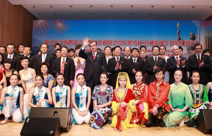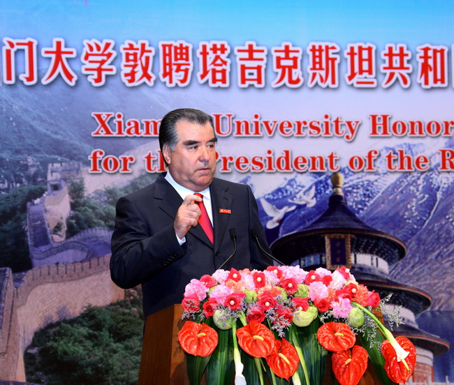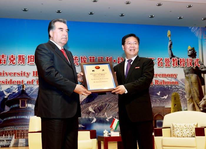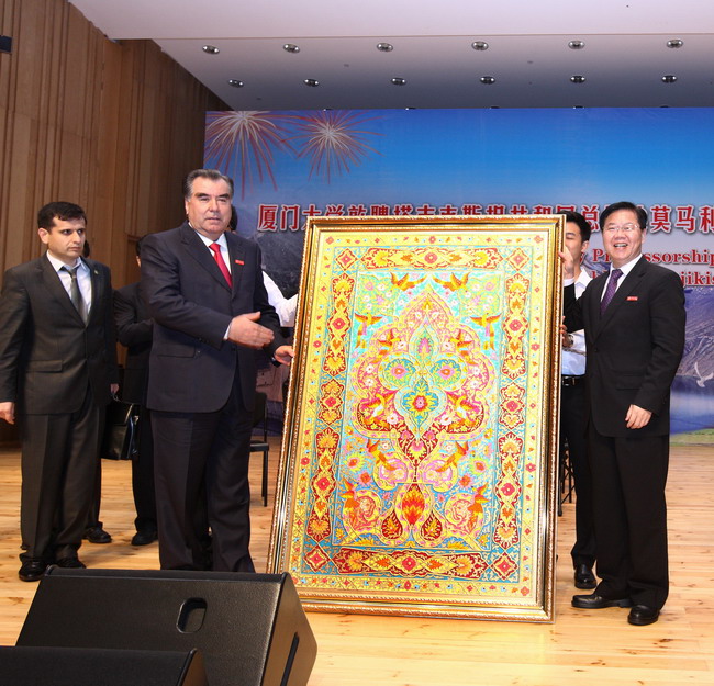 6月2日上午,塔吉克斯坦共和国总统拉赫蒙(Emomali Rahmon)阁下访问我校。学校敦聘拉赫蒙总统阁下为厦门大学名誉教授,校长朱崇实为拉赫蒙总统阁下颁发证书并佩戴厦门大学校徽。