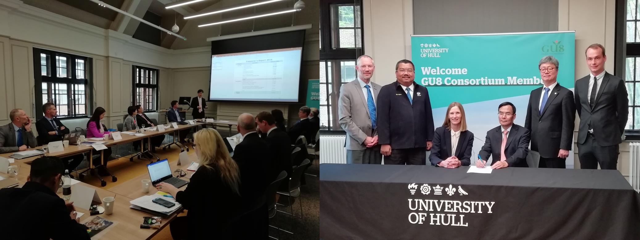 在赫尔大学,杨斌代表我校出席全球八校联盟第10届校长联席会议并代表联盟轮值主席张荣校长作开场致辞。在致辞中,他提出,各联盟成员应明确若干重点合作学院及领域,鼓励教师结对子进行联合科研和共同发表论文,积极开展学生交流,进而推动联盟成员全方位合作。联盟秘书长作了联盟总体情况的报告,会议还审议了联合科研委员会、教育委员会的进度报告及联盟财务报告,通过了联盟新网站设计规划。会议还就联盟行政架构及职能划分、设立卓越研究中心及未来规划等达成共识。本次会议选举了赫尔大学担任下届联盟轮值主席,通过了法国列阿佛尔大学2020年召开教育和科研委员会会议,及厦门大学2021年百年校庆期间举办第11届校长联席会议的决议。英国赫尔大学、法国列阿佛尔大学、德国马德格堡大学(弗劳恩霍夫研究所)、韩国仁荷大学、马来西亚玻璃大学、厦门大学共6所高校校长及代表20余人参加会议。