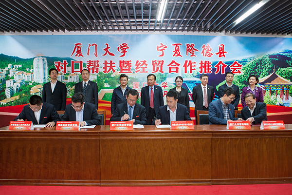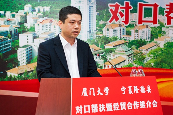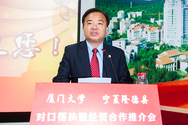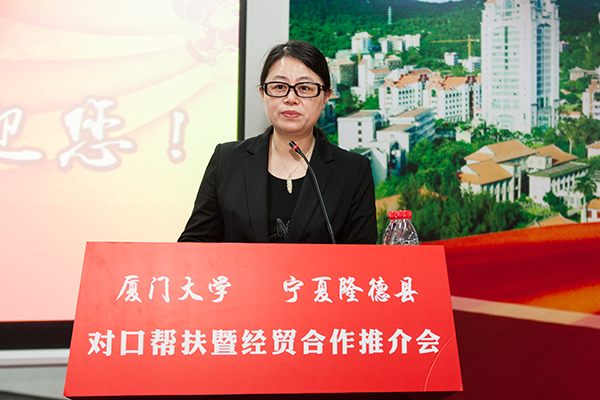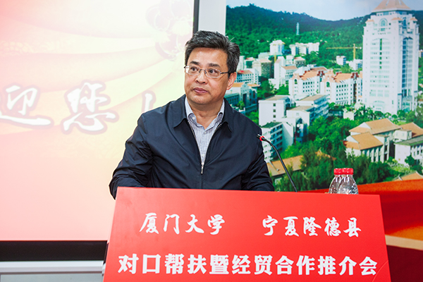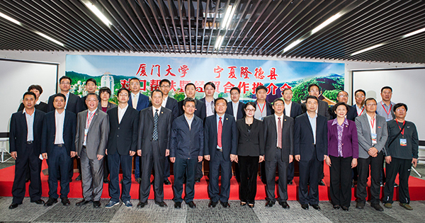 4月6日上午,厦门大学-宁夏隆德县对口帮扶暨经贸合作推介会在我校举行。宁夏固原市委常委、副市长陆菁,隆德县委书记袁秉和、县人大常委会主任王勇、县政协主席王升,我校党委书记张彦,副书记、副校长李建发,副书记林东伟、副校长詹心丽,中汇宝网络科技股份有限公司、鹭燕医药科技有限公司、上海亿豪医疗器械有限公司、方家铺子(莆田)绿色食品有限公司、福建康业投资有限公司等企业负责人出席。会议由副校长叶世满主持。