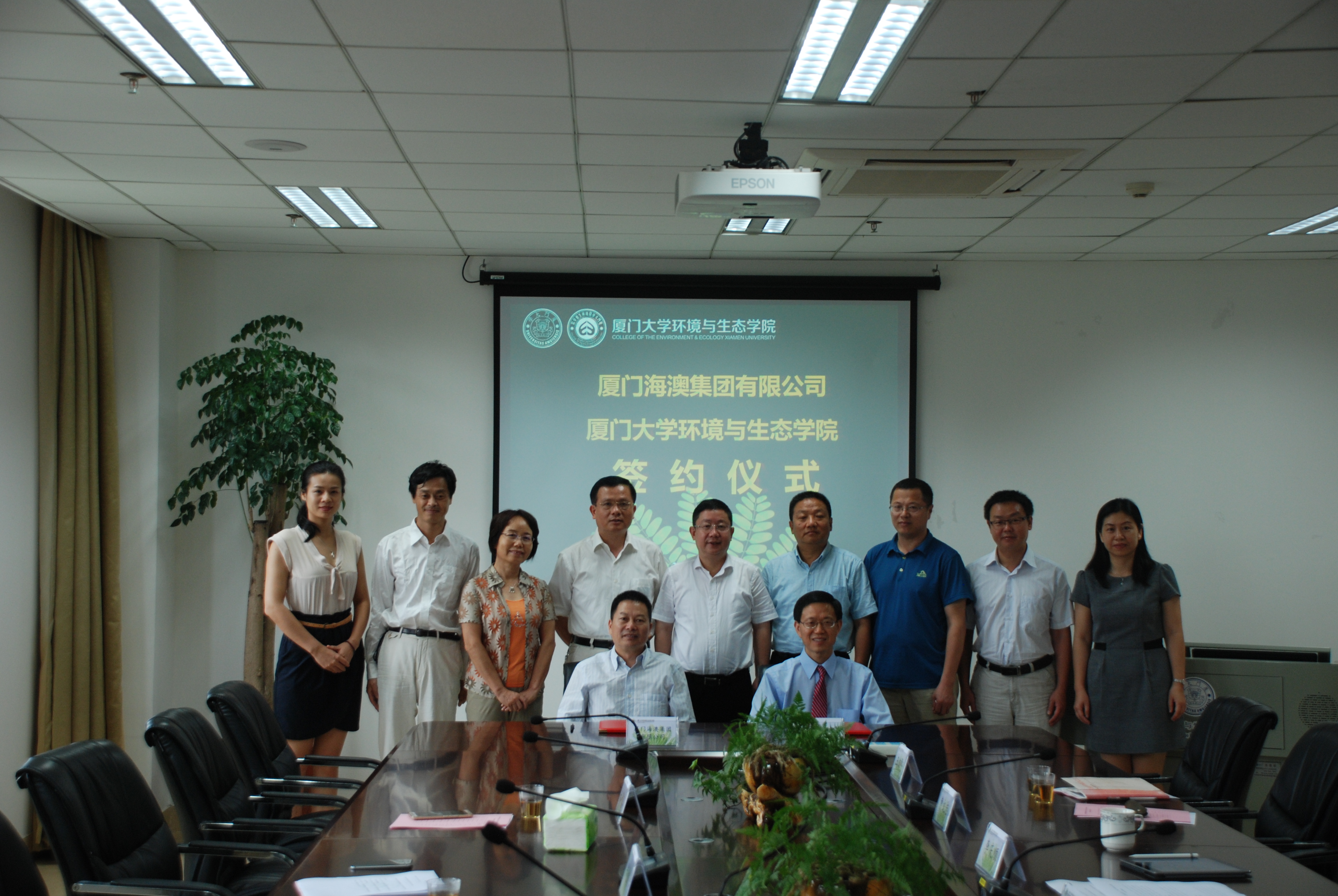 为加强校企合作,环境与生态学院与厦门海澳集团有限公司(以下简称“海澳集团”)6月8日举行战略合作签约仪式。海澳集团董事长、学院大楼捐赠者郑金泉、工程部总监林钟喜、人力资源部总监林霞、环境与生态学院院长李庆顺、党委书记沈小平、副院长曹文志、学院各系副主任等参加了签约仪式。