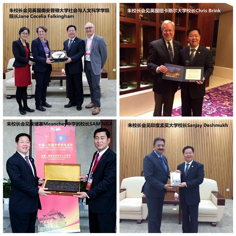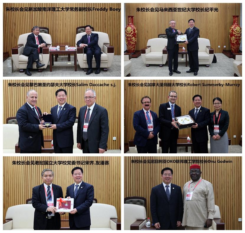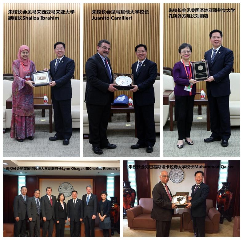 这些国外知名高校代表团包括英国纽卡斯尔大学校长Chris Brink、加拿大圣玛丽大学校长Robert Summerby-Murray、马耳他大学校长Juanito Camilleri、尼日利亚OKO联邦理工学院校长Onu Godwin、巴基斯坦卡拉奇大学校长Muhammad Qaiser、印度孟买大学校长Sanjay Deshmukh、老挝国立大学校党委书记兼副校长宋齐·友潘赛(Somsy Gnophanxay)、黎巴嫩圣约瑟夫大学校长Salim Daccaches.j.、马来西亚世纪大学校长纪平光(Patrick Kee Peng Kong)、新加坡南洋理工大学常务副校长兼教务长Freddy Boey、美国特拉华大学副教务长Lynn Okagaki和Charles Riordan、马来西亚马来亚大学副校长Shaliza Ibrahim、美国圣地亚哥州立大学孔院外方院长刘丽容、英国南安普顿大学社会与人文科学学院院长Jane Cecelia Falkingham 朱崇实校长对代表团专程来访表示由衷的欢迎和感谢。各代表团纷纷送上对九十五周年校庆的热烈祝贺,并赞赏我校九十五周年校庆办得意义非凡,特别是21世纪海上丝绸之路大学校长论坛,为增进沿路国家大学间的交流与合作、促进多元文化的交流互鉴提供了重要的平台。巴基斯坦卡拉奇大学校长Muhammad Qaiser专门提出将通过该校孔子学院将当地的汉语储备教师派到我校参加语言培训。各代表团还分别就今后如何与我校扩大合作领域、促进学生交流、深化科研合作、创新合作模式、提高合作成效等方面与朱崇实校长交换了意见,尤其就今后在国际化人才培养以及在厦大马来西亚校区建设方面寻找共赢共享的合作模式进行了探讨。
