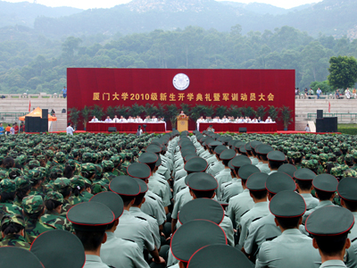 朱崇实首先致辞。他代表学校热烈欢迎来自五湖四海的新同学,向支持和帮助新生选择厦门大学的家长和老师们,向参训部队的全体官兵致以崇高的敬意和衷心的感谢。