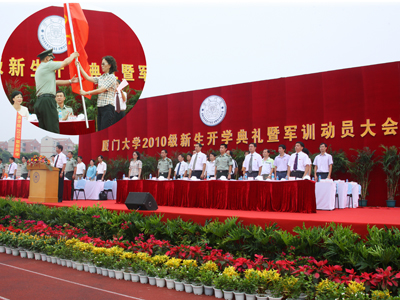 部队首长用“三个祝贺”、“六个体现”和“四个好”完成了讲话。他祝贺厦大迎来新同学并顺利开学开训、祝贺2010级新生顺利考入厦门大学,翻开人生新一页、祝贺2010级新生即将奔赴训练场;希望同学们在未来的训练场上,体现精气神、凝聚力、战斗力、防护力、控制力和保障力;希望通过军训,展现厦门大学好、90后大学新生好、承训官兵好、本次军训好。