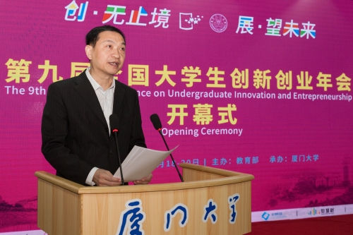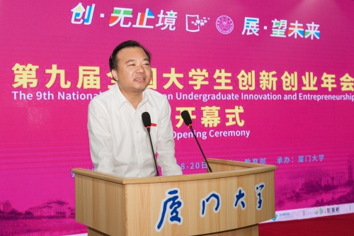 我校党委书记张彦,教育部高教司司长张大良,福建省政协副主席薛卫民,沈阳化工大学校长、国创计划专家组组长李志义出席开幕式并共同启动第九届全国大学生创新创业年会。中国人民大学副校长、国创计划专家组副组长洪大用,西北工业大学副校长、国创计划专家组副组长万小朋,华中科技大学副校长、国创计划专家组副组长许晓东,大连理工大学副校长、国创计划专家组副组长朱泓,重庆大学副校长、创新方法教指委副主任委员李茂国,我校党委副书记林东伟等参加大会开幕式。开幕式由副校长邬大光主持。