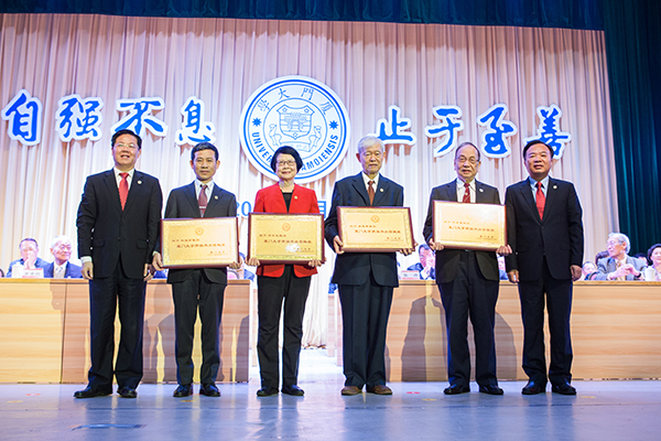 师生员工是建设世界一流大学的主体,学校的每一个进步,都离不开师生员工的不懈奋斗,也正因为如此,厦门大学这艘巨轮才乘风破浪、稳健前行。今天,我们将颁发第五届“南强杰出贡献奖”。今年的获奖者分别是林祖赓教授、洪华生教授、张亦春教授和杨国桢教授。这四位教授分别在不同的学科,教学与科研的方向各不相同,但是他们的一个共同点就是都把毕生的精力奉献给了教育事业和科学事业,都为厦大的人才培养、科学研究和学科建设作出了杰出贡献。我们还将表彰1132位奖学金获得者、338位奖教金获得者和7个课题组。这些受到表彰的同学和老师都是厦大优秀师生的杰出代表。我们要以他们为榜样,践行自强不息、止于至善的校训精神,志存高远、锤炼品德、务实进取、奋发有为,努力在实现厦大梦的伟大实践中创造自己的精彩人生。我提议,让我们以热烈的掌声向获奖的老师和同学表示热烈的祝贺和崇高的敬意!