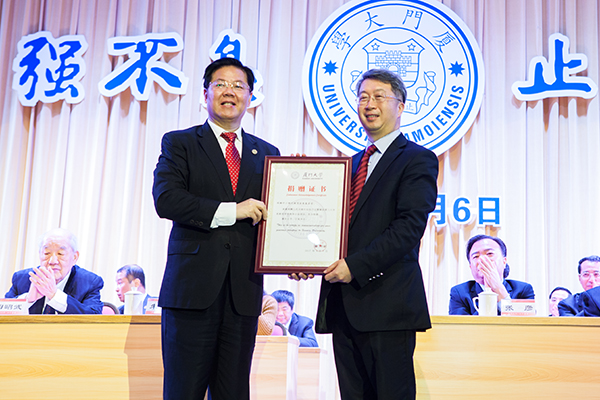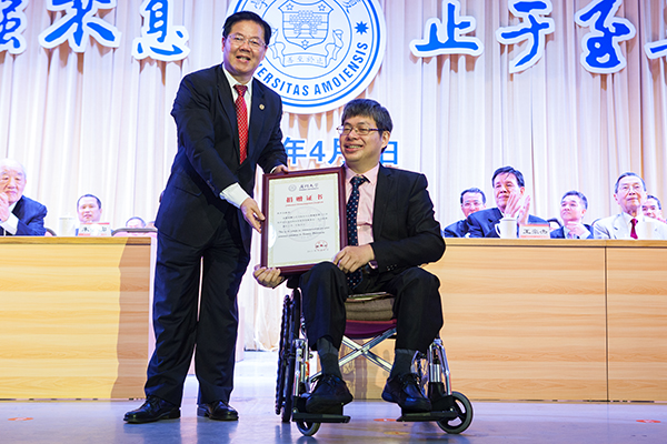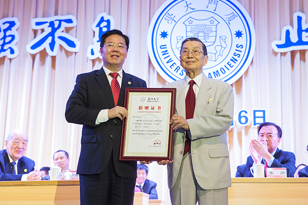 在我校96周年校庆之际,一批杰出校友、热心企业和人士以捐钱捐物的方式支持我校教育事业发展。校庆大会上,举行了5场简朴而隆重的捐赠仪式,以感恩的心情接受邵建寅先生、福建省农村信用社联合社、化学系热心校友、闽都中小银行教育发展基金会对于厦门大学的无私馈赠和深厚情谊。朱崇实代表学校接受捐赠并向捐赠者颁发了捐赠证书。