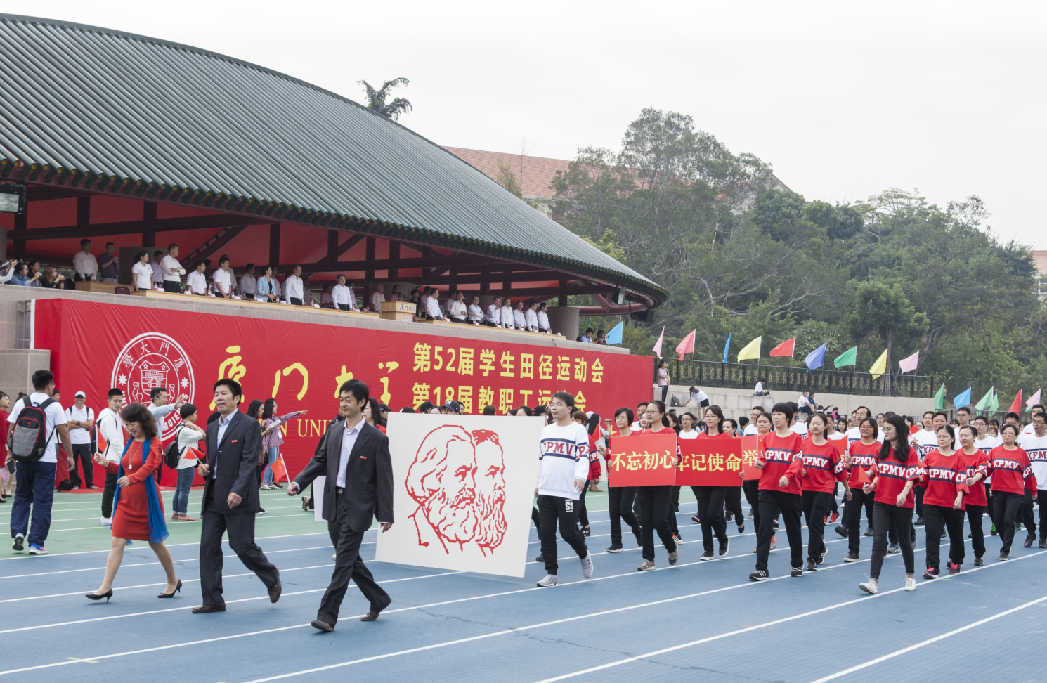 伴着振奋人心的运动员进行曲,入场式于八点三十分正式开始。思明校区各大学院的的方队井然有序地进入场地,昂首挺胸,雄姿英发。最先映入眼帘的是来自经济学院和王亚南经济研究院的师生队伍,他们高举旗帜,迈着坚定的步伐经过主席台,尽显我校学子昂扬向上的风采;来自人文学院的师生方阵充分展现了厦大学子“文能提笔安天下,武能演武定乾坤”的风采,他们用自己的实际行动诠释了“健康人文”的理念;来自材料学院的方队迈着矫健的步伐,高喊着嘹亮的口号,精神抖擞,步履从容,他们用“真材实料”告诉世界什么是真正的风采;来自法学院的师生队伍们高喊着“厦大法律,响彻寰宇,南强学子,再创佳绩”的口号,他们坚定的目光展现了属于南方之强的英姿。不同学院方阵各具特色,共同为体育场增添了一抹鲜亮的色彩。
