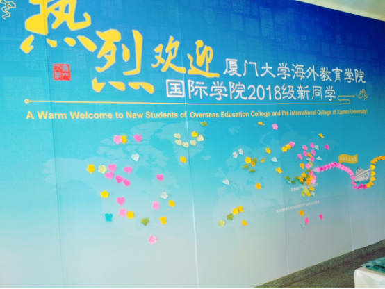 在翔安校区坤銮楼一楼大厅的迎新点,背景墙上是一幅世界地图,上面清晰地标注出厦门大学、厦门大学马来西亚分校和厦大嘉庚号的位置。来自世界各地的新生在办完手续后可以用便利贴上写下自己的“厦大梦想”。一个早上,墙面便贴满了各种语言、各种文字的心愿和祝福。“中国情怀,世界眼光”,学院也希望来自世界各地的新生同学能够在一入学就朝着这个目标扬帆起航,不断前进。