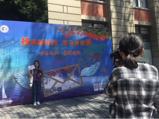 在外文学院迎新点,一位新生往展板投入给2035年的自己的明信片后,留影纪念。在新生报到前,外文学院提前收集了每一位新生的照片和给予2035年的自己的一句话,印在“写给2035年的自己”的主题明信片上,新生抵达迎新点注册后,将在自己专属的明信片上签名,并在背景板前合影留念,最后将明信片投入梦想信箱中。
