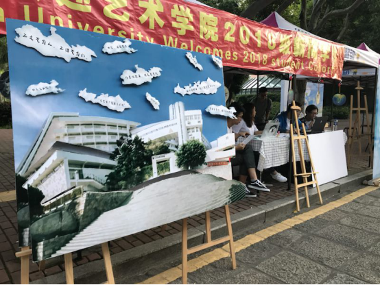 在艺术学院迎新点,艺术学院楼被做成了立体展板,标语用云朵的形式展现,还绘制了小头像作留念。一把把古典风的小扇子,上面是学长学姐们的习作。独有的欢迎萌新形式,是来自艺院大家庭的温暖问候。
