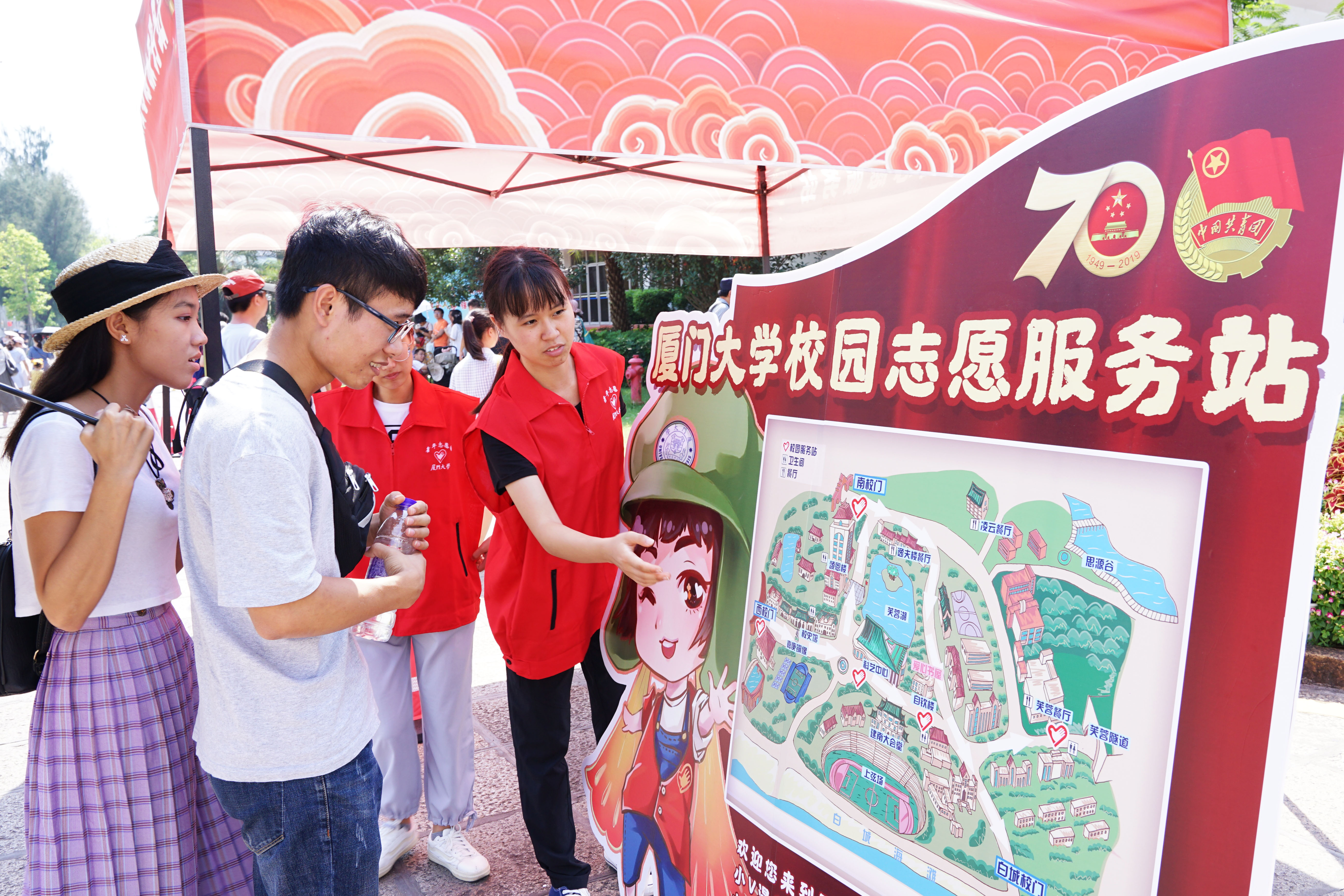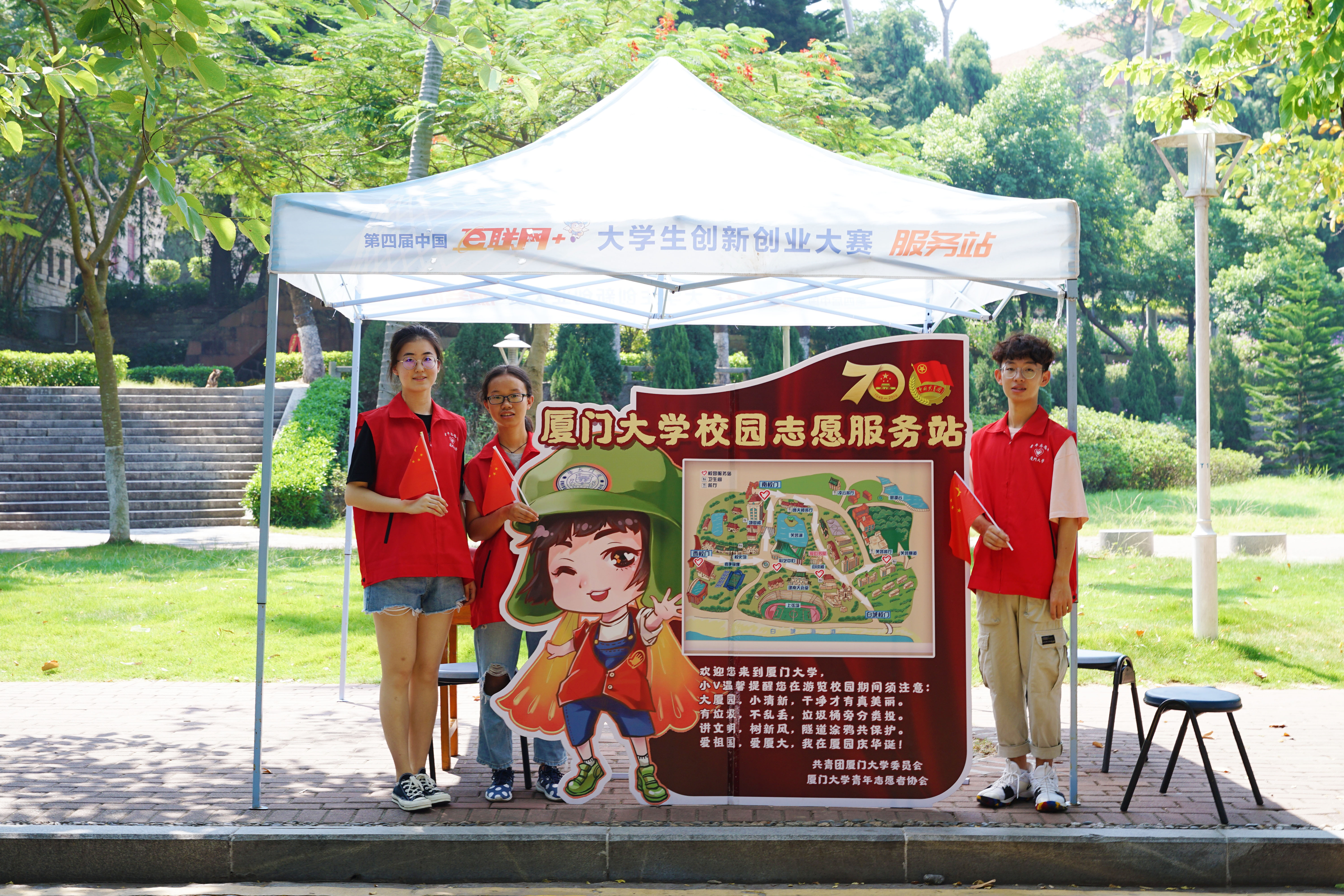 今年国庆期间,校青年志愿者行动指导中心在思明校区设立了5个服务点:群贤校门,大南校门,科艺中心前,三家村广场,芙蓉隧道口,共招募志愿者133名。更为特别的是,今年增加了垃圾分类投放引导、劝阻乱涂乱画的职能。与此同时,还增添了庆祝中华人民共和国成立70周年的元素。