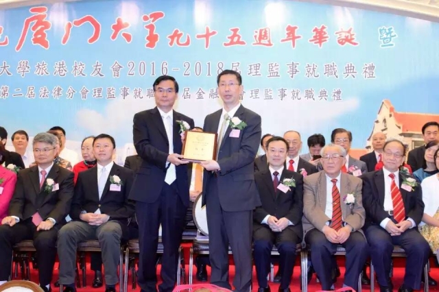我校副校长杨斌,香港校友会新任理事长方平,香港厦门联谊总会前任理事长、我校香港校友会荣誉会长王少华,香港中联办教育科技部副巡视员刘志明,香港福建社团联会荣誉主席林广兆,香港校友会2014-2016届理事长徐兰芳,香港校友会新任监事长周韬,香港校友会首任金融分会会长陈少杰以及各界校友700余人出席并参加了本次庆祝我校95周年华诞和香港校友会新一届理监事就职典礼。