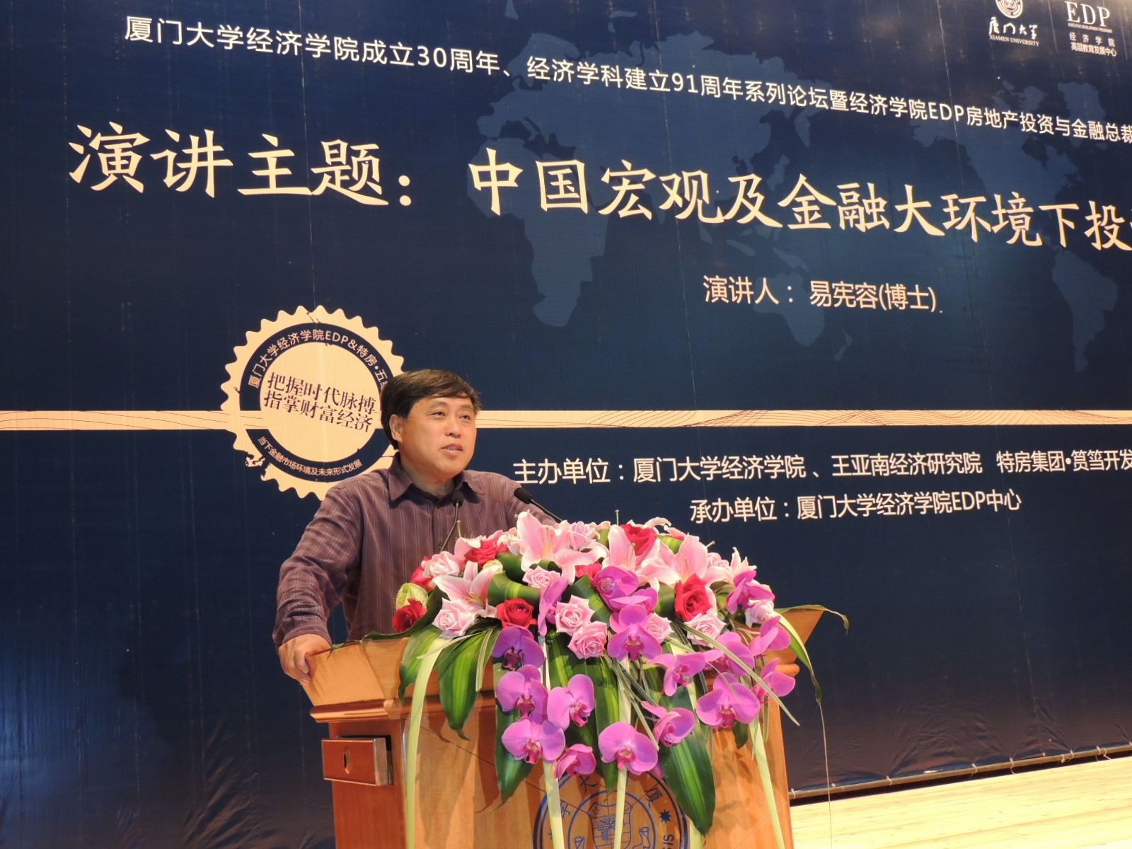 6月2日,中国社会科学院金融研究所研究员易宪容博士应邀参加厦门大学经济学院建立30周年暨经济学科创立91周年系列论坛、经济学院EDP中心房地产投资与金融总裁班(首期)开班论坛,做题为《中国宏观及金融大环境下投资方向探究》的专题演讲。本次论坛由厦门大学经济学院、王亚南经济研究院和厦门特房集团筼筜开发共同主办,厦门大学经济学院EDP中心承办。论坛现场气氛热烈,来自社会各界的800余名嘉宾聆听了学术讲座。