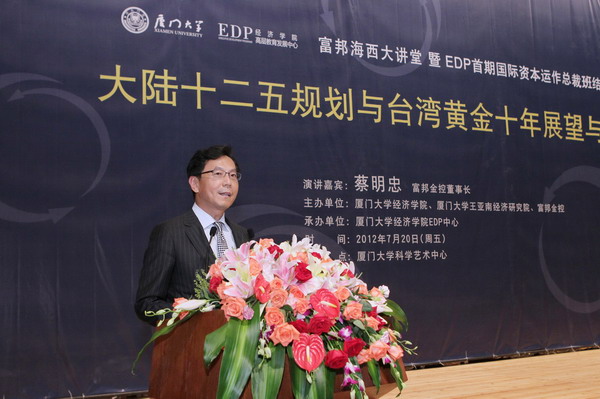 7月20日下午,应厦门大学经济学院与王亚南经济研究院的邀请,台湾富邦金控董事长蔡明忠在科学艺术中心三楼报告厅做了题为“大陆十二五规划与台湾黄金十年展望与合作”的演讲。原厦门市委书记、市长邹尔均,原厦门市常务副市长丁国炎,厦门大学副校长赖虹凯,厦门金融行业的相关领导,经济学院EDP中心学员以及经济学院与王亚南经济研究院2012年“全国优秀大学生暑期夏令营”营员共700余人参加了该活动。此为“厦门大学富邦海西大讲堂”(以下简称“富邦大讲堂”)开堂之讲。