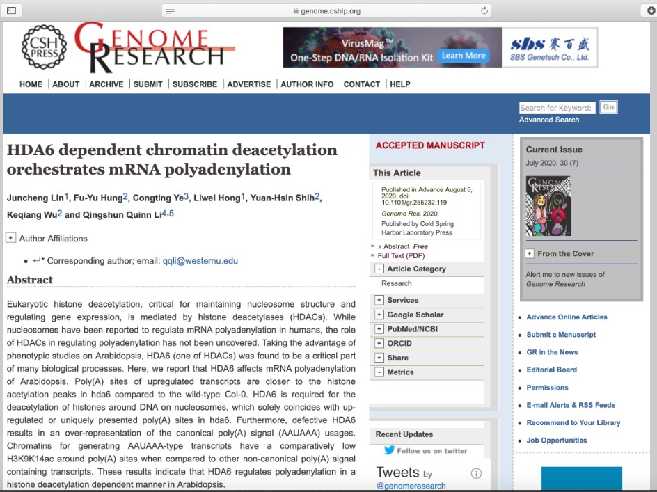 在过去四年里,李庆顺课题组及其合作者以拟南芥这一模式植物为研究对象,借助表观组学、基因测序技术等现代研究手段,揭开了这一秘密,即polyA信号的识别与包裹在DNA上的组蛋白的乙酰化有着密切关系:当研究者对这种蛋白进行去乙酰化的处理后,polyA信号被识别的程度便会明显不同。DNA上的组蛋白乙酰化一般是调控基因“抄录”的表观遗传信息,它能影响植物的polyA过程还鲜为报道。这就意味着,可利用这样的机制实现对polyA效率的调控。