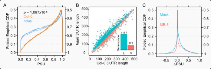 HDA6调控拟南芥mRNA多聚腺苷化(CDF为累积分布频率,PSU为单个poly(A)位点占整个基因表达的比率,L、S分别代表基因偏好使用3’UTR远端、近端的poly(A)位点,△PSU为突变体hda6与Col-0的差值)