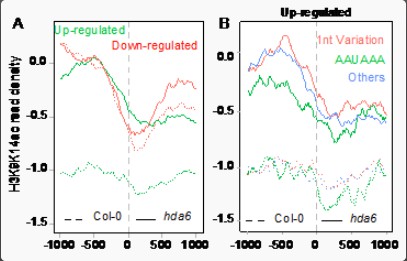 HDA6调控多聚腺苷化位点附近的H3K9K14乙酰化水平(“0”表示添加poly(A)时的剪切位点,“1nt variation”代表AAUAAA的1个碱基变异体,“others”代表其他未知的poly(A)信号)