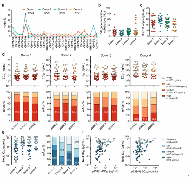 该研究利用深度测序对各志愿者接种戊肝疫苗过程中不同时间点的抗体组进行分析,以HEV特异性全人单抗为诱饵,探索戊肝疫苗接种过程中志愿者体内特异性抗体的发生、发展和成熟。抗体的产生由抗体胚系基因重排、演化、编码而来,人体中编码抗体的IGHV基因约有50种。研究者分析发现,戊肝疫苗诱发的特异性抗体胚系基因来源多样,50种IGHV基因中的28种都能够发展为戊肝疫苗特异的抗体。从各抗体基因来源占比分析,抗体胚系基因主要来源于IGHV1-69、IGHV1-18和IGHV3-30,其中IGHV1-69家族的抗体为优势抗体,在每名志愿者中达到了21.43%-43.48%。IGHV1-69也是流感病毒、呼吸道合胞病毒、登革病毒和丙型肝炎病毒等病原体诱发产生中和抗体的主要来源,是不同人群抗体基因的主要来源之一。这些发现提示戊肝疫苗能够在全世界不同人群中高效地激起机体抗体应答。