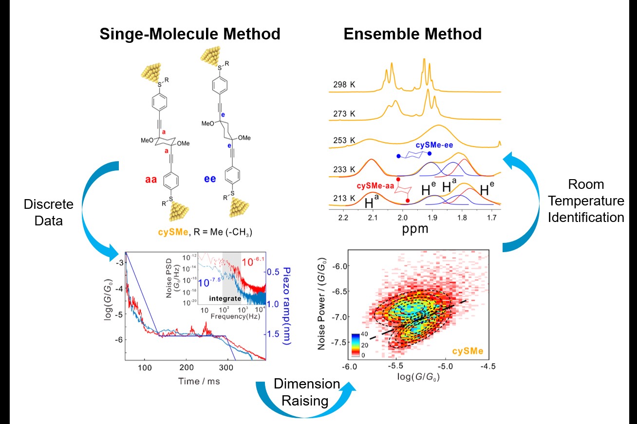 构象异构是化学中的基本问题。然而对于环己烷等柔性分子,由于其在室温下极快的互变异构过程,基于系综的表征方法(如核磁等)只能得到所有构象平均贡献的结果。因此,在室温条件下,对柔性分子构象的定量分析与表征极具挑战。为了应对这一挑战,他们发展了基于单分子电学表征的构象识别技术,即在单分子电学表征的基础上,将数据升维以及离散数据挖掘等智能数据分析技术应用到单分子事件的统计分析中,在室温条件下成功实现了对环己烷两种椅式构象的电学表征与比例识别。同时,通过纳米电极间隙对分子的限域作用,我们发现在宏观尺度下极不稳定的扭船式中间体得以在单分子尺度稳定存在,这为不稳定中间体的研究提供了重要表征方法。