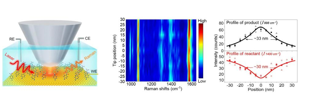 该工作利用课题组前期自主发展的电化学针尖增强拉曼光谱技术(EC-TERS,J. Am. Chem. Soc., 2015, 137, 11928; Anal. Chem., 2019, 91, 11092),发挥具有SP效应的TERS针尖既能催化反应又能增强表面物种拉曼信号的优势,原位表征光、电对SP热载流子催化反应效率的调控过程及机制。进而,该工作通过调控电位开关SP热载流子催化的反应,即在高电位触发反应,然后在低电位不发生反应时,利用TERS高空间分辨的优势,表征高电位下产生的反应产物的空间分布。该方法实现了有效热载流子催化反应区域的纳米分辨成像,使反应区域在实空间的分布可视化。实验上获得了有效热载流子的输运距离,从而证明了能量越高的热载流子越需要在更短的输运距离范围内收集捕获。