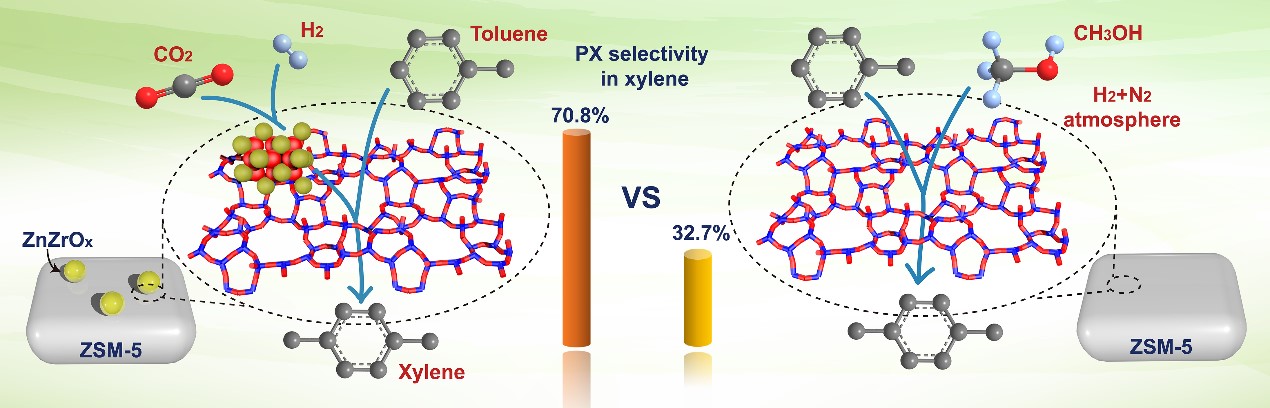 PX是石化工业的基本有机化工原料之一,主要用于生产三大合成材料—合成树脂、合成纤维和合成橡胶。随着我国下游产业的快速发展,PX的需求量迅猛增长,进口依存度大于50%。采用甲醇与甲苯选择性烷基化反应制PX是一条热门且较为经济的技术路线,虽然,国内外众多研发机构和公司投入大量的人力物力研发,但其反应温度高达420~480 °C,与甲醇制烯烃(MTO)反应温度接近,容易产生副反应。该反应温度较高的主要原因在于甲醇较难转化为活性烷基化基团。袁友珠教授课题组在前期开展CO2加氢制甲醇的研究中(Appl. Catal. B: Environ. 2019, 251, 119; Catal. Sci. Technol. 2018, 8, 1062)注意到CO2催化加氢制甲醇经甲酸盐路径反应机理的甲氧基中间体。因此,他们提出使用CO2和H2替代甲醇作为甲苯烷基化试剂,利用CO2和H2在相对较低温度下生成的甲氧基中间体(无需经甲醇)直接与甲苯烷基化。