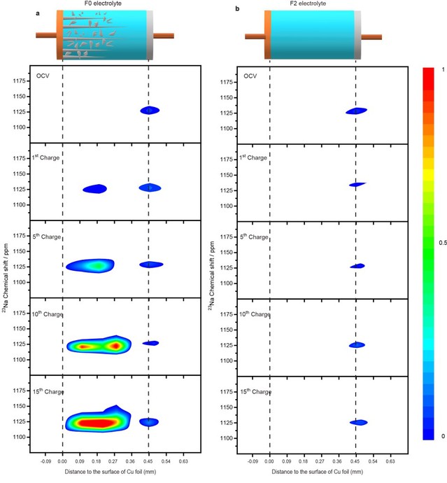 由于钠元素资源丰富且成本较低,有望应用于规模化储能电池领域,近年来安全长寿命的钠基电池引起了人们极大的兴趣。钠金属负极具有1165 mA h g-1的高理论比容量和-2.71 V的低工作电压,这使其成为钠基电池的理想负极材料。然而,由于在充放电过程中容易生成钠金属微结构(SMSs,即枝晶状和苔藓状的Na金属)并在电极表面固体电解质界面(SEI)层的堆积,限制了其实际应用。另外钠金属微结构的生长随时间演化,很难通过常规的非原位分析方法来表征,迫切需要一种原位表征技术来定量研究其生长和演化过程,理解其对钠金属电化学溶解-沉积过程的影响。杨勇教授团队发展了原位23Na磁共振成像(MRI)和原位核磁共振(Operando NMR)技术,为钠金属微结构的形成和演化提供空间分辨和定量的认知。实验结果表明,不断增长的SMSs首先会导致沉积过电位线性增加,直到达到0.15 V的过渡电压为止。此时触发电解液的剧烈电化学分解,从而导致生成苔藓型的SMSs和电池的快速失效。此外,借助23Na高分辨魔角旋转核磁结果也证明了钠金属表面SEI中NaH的存在。