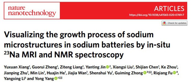 近日,化学化工学院杨勇教授课题组在可充钠金属电极的固体核磁共振技术研究上取得重要进展,相关成果以“Visualizing the growth process of sodium microstructures in sodium batteries by in-situ 23Na MRI and NMR spectroscopy”为题,2020年7月27号在线发表于《自然•纳米技术》(Nature Nanotechnology DOI:10.1038/s41565-020-0749-7)。