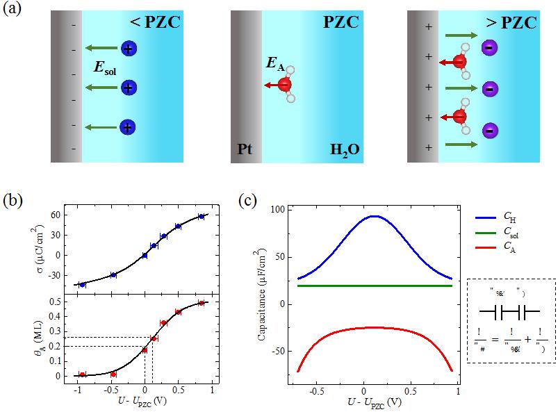 双电层对于电化学界面过程的意义重大,但目前依然对其缺乏足够的微观认知。在该工作中,结合第一性原理分子动力学方法和课题组自身发展的电极电势计算方法(计算氢标准电极法,Phys. Rev. Lett. 2017, 119, 16801),程俊教授等人模拟得到了不同电位下的Pt(111)/水溶液界面结构,在深入分析结构的基础上发现了化学吸附水的覆盖度在Pt(111)表面随电位变化遵循Frumkin等温吸附的规律。更进一步,通过理论推导证明了该化学吸附水覆盖度随电位的变化会对电化学界面造成一个负电容的贡献,这拓展了经典的双电层模型对于电化学界面的理解。同时,该负电容能够明显增大紧密层电容,并且在零电荷电位附近形成一个峰,这很好得解释了电化学实验中观察到的“铃铛状”的微分电容曲线,解决了这一困扰基础电化学工作者多年的一个疑问。该工作将为深入理解界面电催化的微观机制提供重要帮助,并有望为双电层超级电容器的设计提供了新思路。