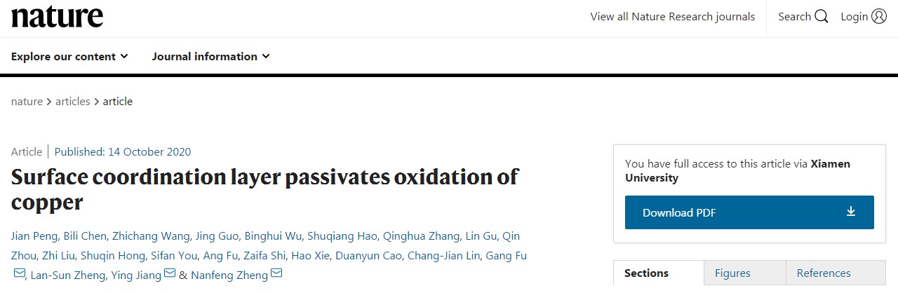 化学化工学院郑南峰教授、傅钢教授团队与北京大学江颖教授课题组密切合作在铜材料表面配位防腐技术方面取得重要进展。相关成果“Surface Coordination Layer Passivates Oxidation of Copper” 于10月14日发表在Nature, 586, 390-394。