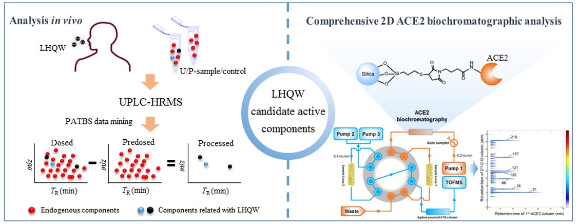 这项研究基于HRMS和智能非靶向数据挖掘技术,全面分析了对多次给药后人血浆和尿液中的连花清瘟胶囊成分,合成了全新的ACE2生物色谱固定相,筛选出连花清瘟胶囊提取物和人尿液样品潜在的ACE2靶向成分。最终,确定了8种暴露于人体且具有潜在ACE2靶向能力的连花清瘟成分,通过SPR、ACE2活性抑制和分子对接实验进一步进行药效学评价。发现大黄酸,连翘酯苷A,连翘酯苷I,新绿原酸及其异构体均对ACE2具有较高的抑制作用。这些化合物通过阻断新冠病毒S蛋白与ACE2结合以及结合在新冠病毒S蛋白-ACE2复合体表面抑制SARS-CoV-2的潜在作用,协同发挥防治COVID-19的作用。