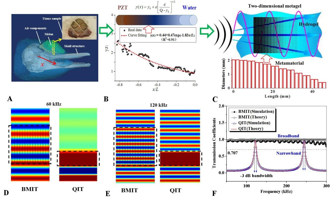 图1 A. 海豚头部的三维重建和组织样本;B. 海豚声主轴方向的阻抗分布函数;C. BMIT阵列示意图和尺寸分布;D-E. BMIT(凝胶-阻抗匹配结构)与QIT(四分之一波长阻抗匹配器)传输性能对比;F. BMIT与QIT频率响应的理论-模拟结果对比;