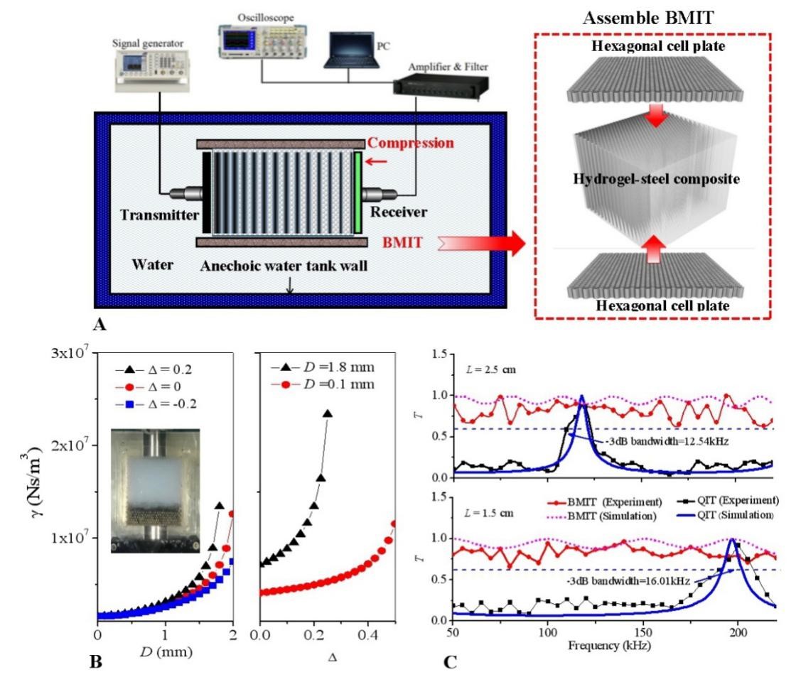 我校海洋与地球学院海洋仿生声学与技术(Marine Bioinspired Acoustics and Technology) 实验室常年致力于生物声学与仿生研究。近日,实验室负责人张宇教授与美国麻省理工学院的方绚莱教授和赵选贺教授合作,结合海豚声学结构、超构材料设计以及水凝胶柔性材料,设计了一种全新的“超凝胶阻抗变换器”(BMIT)。研究团队提出了该阻抗变换器的不均匀声传输理论,揭示了其宽带声传输的工作机理。进一步,研究团队在开展的水下超声探测实验中,将超构结构嵌入至水凝胶基体中,实现BMIT的阻抗渐变特性与柔性可调。测量结果表明该人工结构能够实现水下宽带声传输与目标探测。BMIT结合海豚仿生、超构材料可编程与水凝胶可调的优势,突破传统阻抗匹配器的波长-长度依赖性,其原理可应用于声学、力学、电子学和电磁学等多个领域。