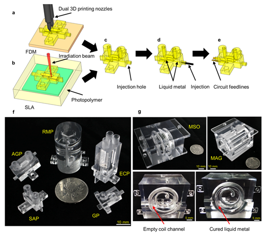 近日,厦门大学电子科学与技术学院、福建省等离子体与磁共振重点实验室陈忠教授团队在国际知名期刊《自然•通讯》(Nature Communications)在线发表了题为“3D-printed integrative probeheads for magnetic resonance”的研究论文。该研究利用高精度3D打印和液态金属灌注技术制备出包含有射频线圈和定制化样品管道结构在内的一体化磁共振射频探头前端,克服了传统磁共振三维微型线圈成型困难、与样品腔匹配程度差等问题,提高了探头的信噪比,为定制化的磁共振检测提供了新思路。