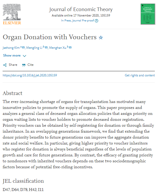 近日,WISE与经济学院Jaehong Kim副教授、李梦玲副教授和许梦涵助理教授合作的论文“Organ Donation with Vouchers” 经济理论顶级期刊Journal of Economic Theory在线发表。