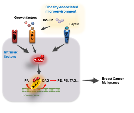 在内外刺激下,Src通过磷酸化lipin-1提高脂质合成而促进乳腺进展和恶化的模式图
