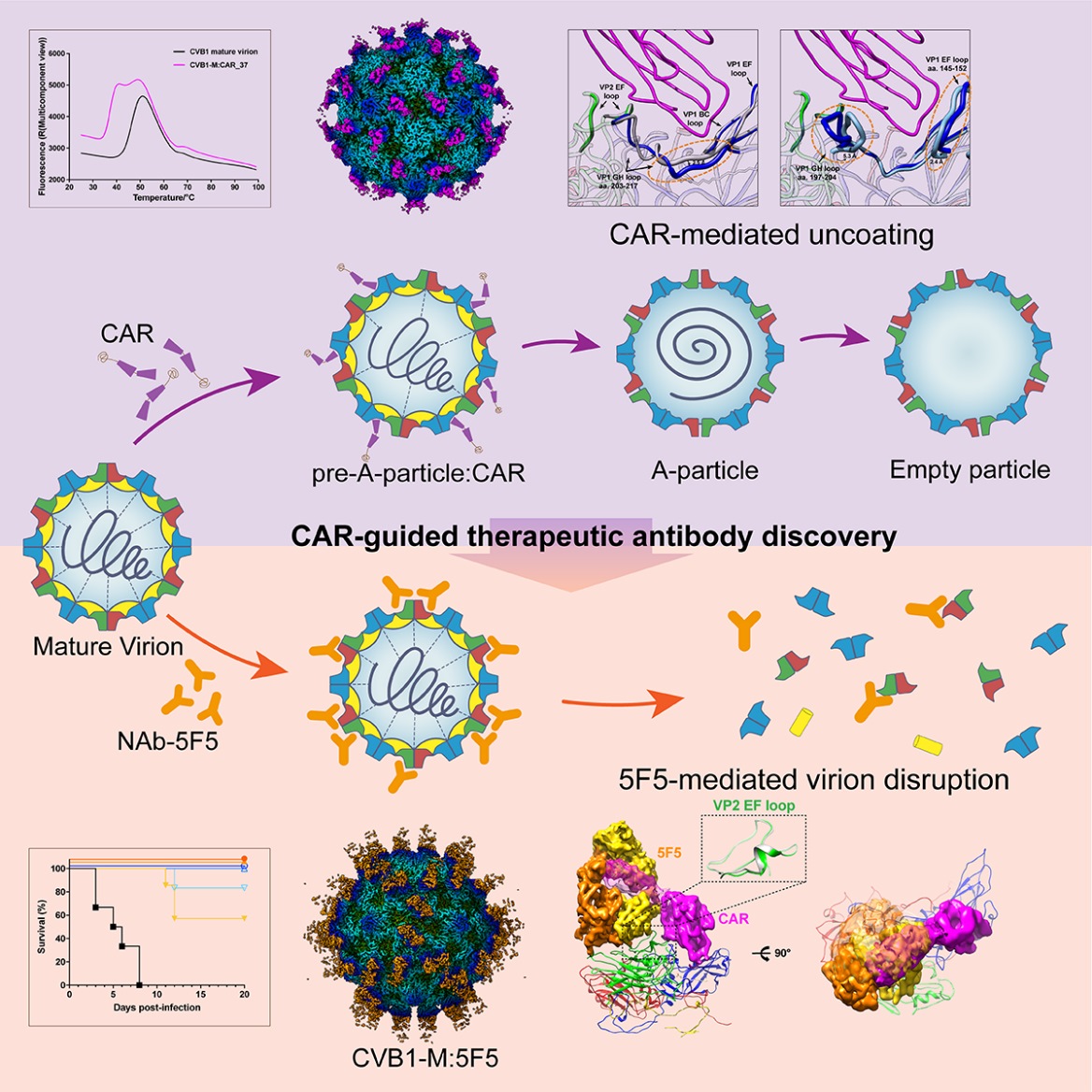 该研究通过构建并解析CVB病毒颗粒及与CAR受体复合物的高分辨率结构,获得在中性pH条件下的一系列代表病毒感染不同阶段的近原子分辨率结构,包括CVB1成熟颗粒(Mature virion)、低温和生理温度下CAR结合的CVB1前体脱衣壳中间态(Pre-A-particle)、脱衣壳中间态(A-particle)和空心颗粒(Empty particle),捕捉到CVB成熟病毒颗粒脱衣壳过程的多种不同中间态及CAR受体相互作用域的一系列的精细构象变化特征。研究显示,CAR结合在病毒表面由衣壳蛋白VP1形成的五倍轴周围的“峡谷”(canyon)区域,相比于其它已知的肠道病毒脱衣壳受体,CAR结合更为深入峡谷凹槽部分,在生理中性pH条件下即可诱导峡谷内部VP1疏水“口袋”(pocket)的塌陷,使得疏水口袋内部维持肠道病毒颗粒稳定性的脂质分子(又称“口袋因子”,pocket factor)释放,从而启动成熟病毒颗粒的脱衣壳进程,推动病毒进一步变构成脱衣壳中间态及空心颗粒,完成病毒完整的脱衣壳及基因组释放过程。该研究阐释了CAR结合驱动CVB感染的分子作用机制,揭示了CVB与CAR之间精确的相互作用方式、结构域特征与关键氨基酸位点,发现受体结合域上可作为潜在高效抗病毒靶标的结构域与关键位点。基于上述发现的指引,该研究筛选到可模拟受体作用特征诱导CVB成熟病毒颗粒失稳及崩解的独特的高效中和抗体5F5。研究发现,5F5可通过空间位阻效应阻断或竞争CAR与CVB的相互作用,不仅能够模拟受体与病毒颗粒的相互作用,还可以通过诱导受体CAR结合域的关键靶点VP2 EF-loop的构象变化从而破坏病毒衣壳的稳定性,并最终导致成熟病毒颗粒裂解而发挥高效的中和作用。