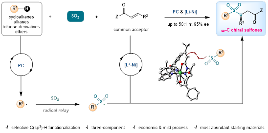 针对上述问题,课题组利用商品化的DABCO∙(SO2)2作为烃基自由基捕获剂,反应中原位释放出二氧化硫分子,快速捕获光反应产生的低浓度、高活性烃基自由基,生成稳定化的砜基自由基,延长活性自由基存活寿命并调节其空间环境,进而与手性镍Lewis酸活化的常规Michael受体相结合(课题组前期利用手性镍配合物催化可见光不对称反应的相关研究:Chem. Sci. 2018, 9, 4562)。在经济、温和的条件下,实现了未活化C(sp3)-H键的三组分不对称砜基化反应,一步构建了具有潜在生物活性的α-手性砜化合物。