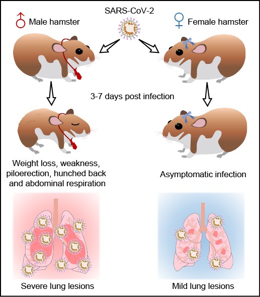 厦门大学和香港大学的联合研究团队基于对新冠病毒易感的叙利亚金黄地鼠开展模型构建与比较研究。研究发现,地鼠对新冠病毒的感染和致病易感性存在性别差异。在疾病生理学特征上,雄性地鼠在感染后可出现较显著的体重下降、虚弱、竖毛、弓背、腹式呼吸(呼吸困难)等表征,与新冠重症患者的部分临床表征相似;而雌性地鼠在感染后的体重下降幅度相对较小且更快恢复,在相关疾病表征上也弱于雄性地鼠,类似于临床上的新冠轻症和无症状感染者。肺部病理学检测结果显示,雄性地鼠感染后肺部可出现大面积肺泡实质性病变、炎性免疫细胞募集和浸润、弥漫性出血、粘液淤积栓塞、胶原纤维异常堆积等较严重的病理学改变,与临床上的间质性肺炎、肺泡炎、重症肺炎、肺水肿和肺纤维化等新冠肺炎症状相似;雌性地鼠感染后的肺组织病变程度、病变面积和复杂程度等表现总体弱于雄性地鼠。研究也发现,在不同攻毒剂量下,雄性地鼠对低攻毒剂量即可出现肺部较广泛感染和较严重的组织损伤,而在雌性地鼠的肺部只观察到轻度组织损伤。并且,雄性地鼠相比雌性地鼠在感染后具有更高的呼吸道病毒滴度,提示了雄性地鼠具有更强的持续泄毒能力和再传播风险。在感染后的血清中和抗体产生水平上,雄性地鼠相对弱于雌性地鼠,提示了性别因素可能影响了动物对病毒感染的免疫应答。上述研究结果揭示,地鼠模型对新冠病毒的感染和致病易感性存在较明显的与人类临床特征相似的性别差异,可为进一步研究性别因素与新冠感染和致病性的相互作用机制提供重要基础。