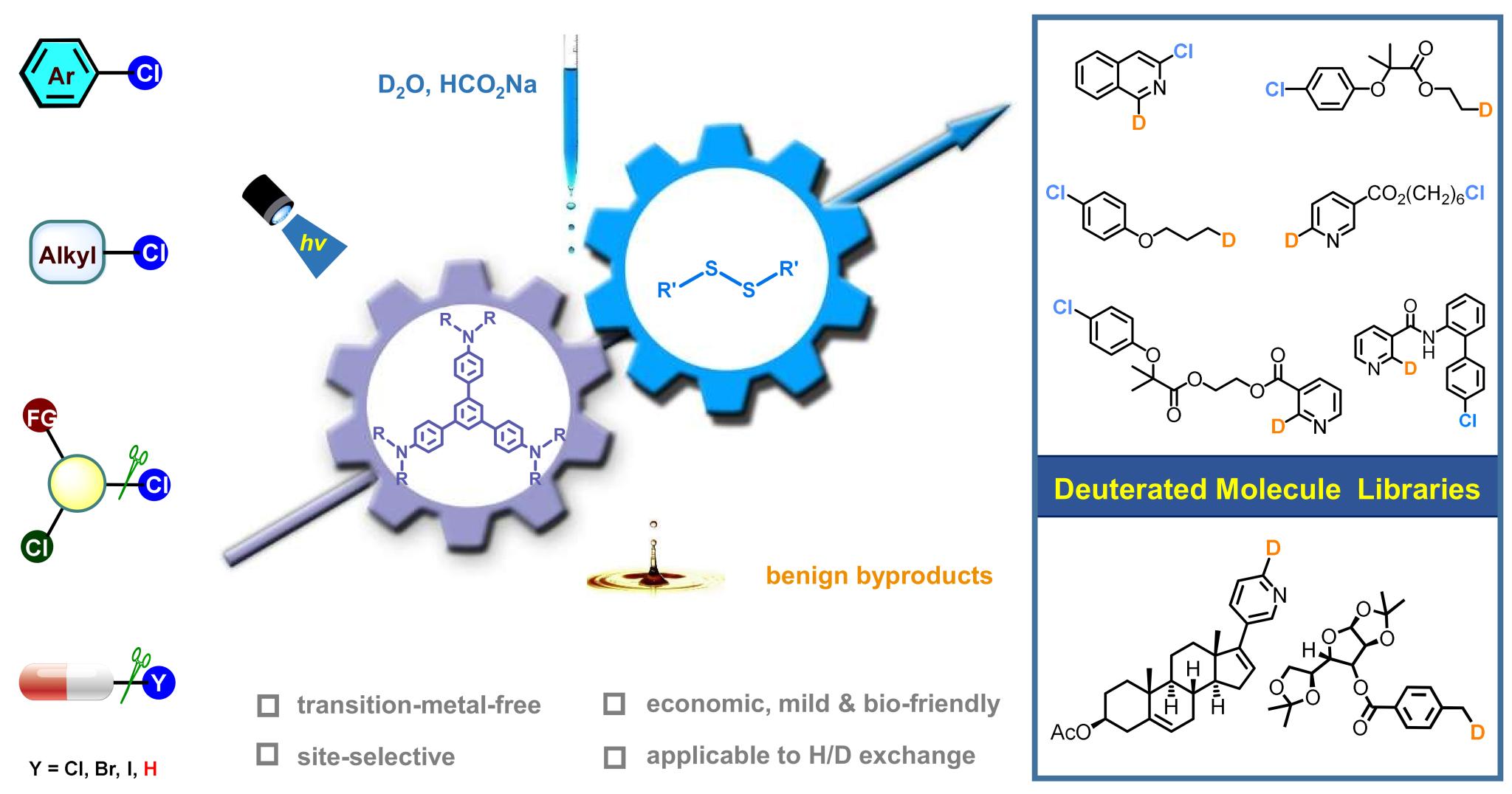 针对上述问题,课题组发展了一种共轭芳香胺和烷基二硫醚组成的有机可见光共催化体系。其中,共轭芳香胺催化剂廉价易得,激发态寿命较长,还原电势高;烷基二硫醚结构简单易调节,具有好的氘转移效率。在可见光照射、室温、空气、DMSO/D2O/甲酸钠等温和的反应条件和经济低毒的试剂作用下,成功地实现了80余种芳基、烷基氯代物的直接脱氯氘化,氘代率最高达99%,反应仅产生CO2、NaCl等副产物。