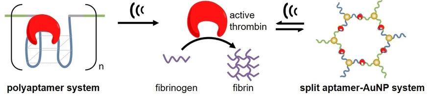 蛋白质是生物体的物质基础,其中的酶几乎参与所有生物反应,酶催化过程的失调与许多疾病的发生密切相关。因此,实现对酶活性的精确调控不仅有利于理解复杂的生物反应过程,更有助于进一步开发新的治疗策略。在这项工作中,研究人员首先利用合成的多聚适配体与凝血酶特异性结合,抑制其催化活性。随后分别使用实验超声(20 kHz)和医用聚焦超声(5 MHz)对多聚适体-凝血酶之间的相互作用进行了选择性破坏,从而恢复了凝血酶活性,催化了纤维蛋白原向纤维蛋白的转化。进一步地,研究人员将其扩展到纳米颗粒-适配体系统。凝血酶的存在将特异性诱导两种金纳米颗粒的聚集组装(表面分别修饰凝血酶裂分适配体),同时使酶失活。超声机械力的施加可以特异性分散颗粒聚集体,同时激活凝血酶的催化活性,重要的是,该体系的超声响应过程完全可逆,可以实现对凝血酶催化活性“抑制-激活”的多次循环。